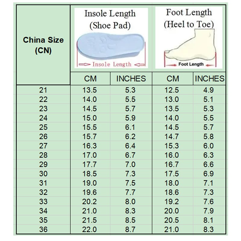 | Shoes Size | 12-18 Months (21#: Foot Length/insole Length: 12.5 cm/13.5 cm), 18-24 Months (22#: Foot Length/insole Length: 13.0 cm/14.0 cm), 2-2.5 Years (23#: Foot Length/insole Length: 13.5 cm/14.5 cm), 2.5-3 Years(24#: Foot Length/insole Length: 14.0 cm/15.0 cm), 3-3.5 Years(25#: Foot Length/insole Length: 14.5 cm/15.5 cm), 3.5-4 Years(26#: Foot Length/insole Length: 14.8 cm/15.8 cm), 4-4.5 Years(27#: Foot Length/insole Length: 15.3 cm/16.3 cm), 4.5-5 Years(28#: Foot Length/insole Length: 16.0 cm/17.0 cm), 5-5.5 Years(29#: Foot Length/insole Length: 16.7 cm/17.7 cm), 5.5-6 Years(30#: Foot Length/insole Length: 17.5 cm/18.5 cm), 6-6.5 Years(31#: Foot Length/insole Length: 17.7 cm/18.7 cm), 6.5-7 Years(32#: Foot Length/insole Length: 18.3 cm/19.3 cm), 7-7.5 Years(33#: Foot Length/insole Length: 18.9 cm/19.9 cm), 7.5-8 Years(34#: Foot Length/insole Length: 19.5 cm/20.5 cm), 8-8.5 Years(35#: Foot Length/insole Length: 20.2 cm/21.2 cm), 8.5-9 Years(36#: Foot Length/insole Length: 20.8 cm/21.8 cm) |