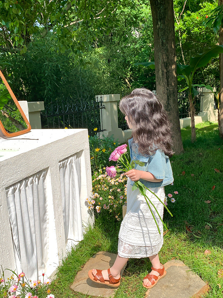 Denim sleeveless jacket with lace 2 pcs dress for girls